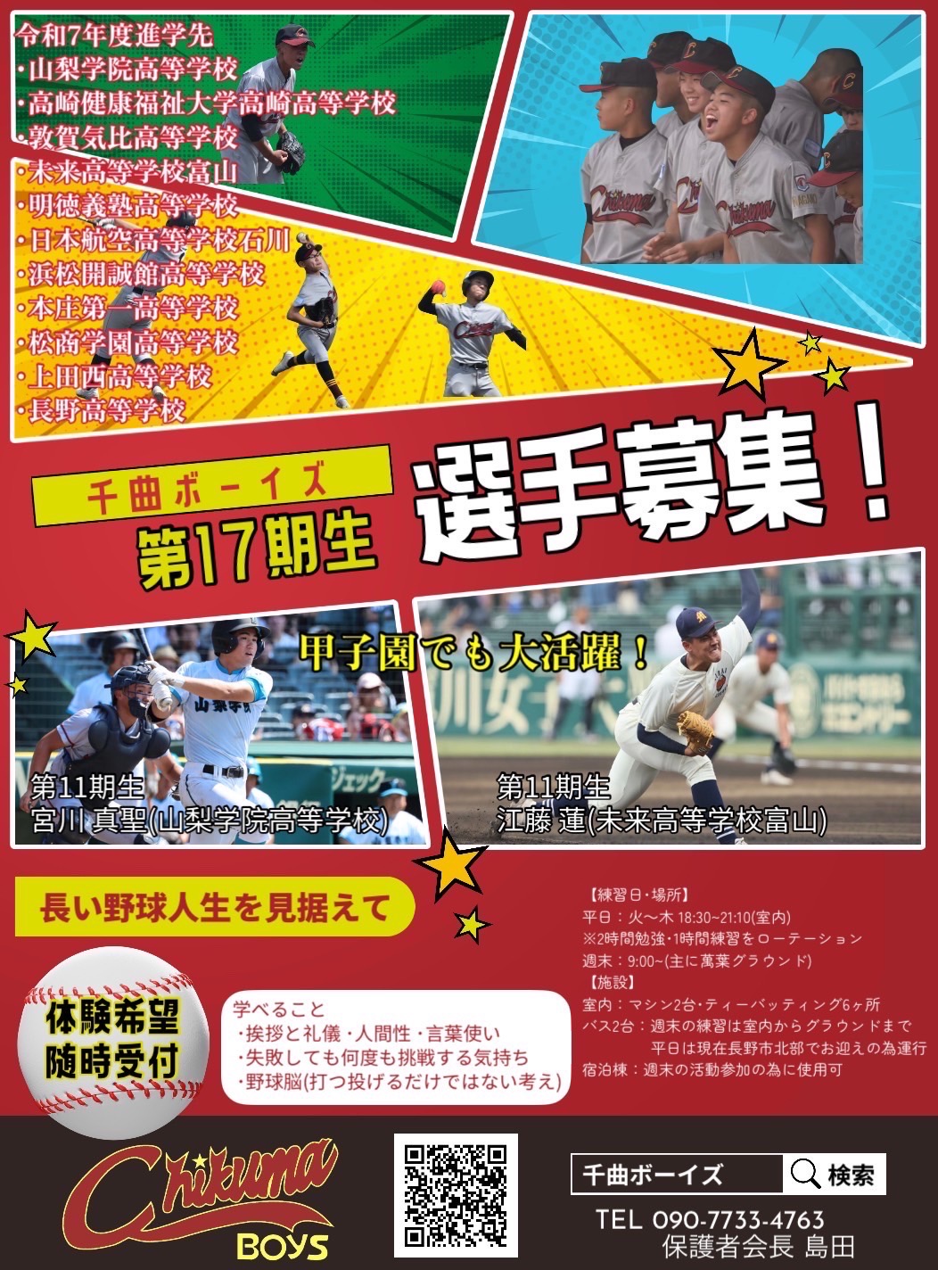 2010年3月27日、千曲ボーイズを設立し活動を開始しました。千曲ボーイズは「感謝」の言葉を胸に刻み、日々、切磋琢磨しております。 文武両道の考えのもと、野球の技術や知識だけでなく勉学の向上にも配慮し学習塾も運営しています。